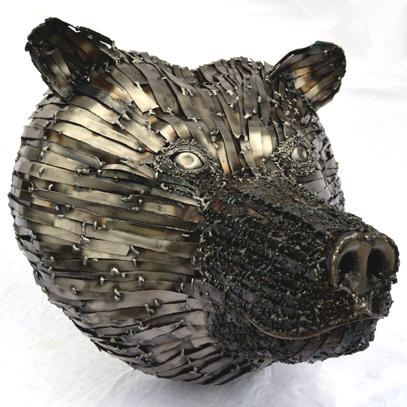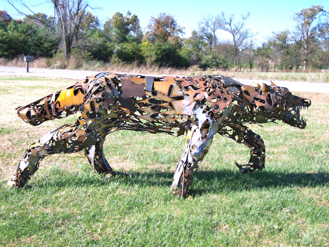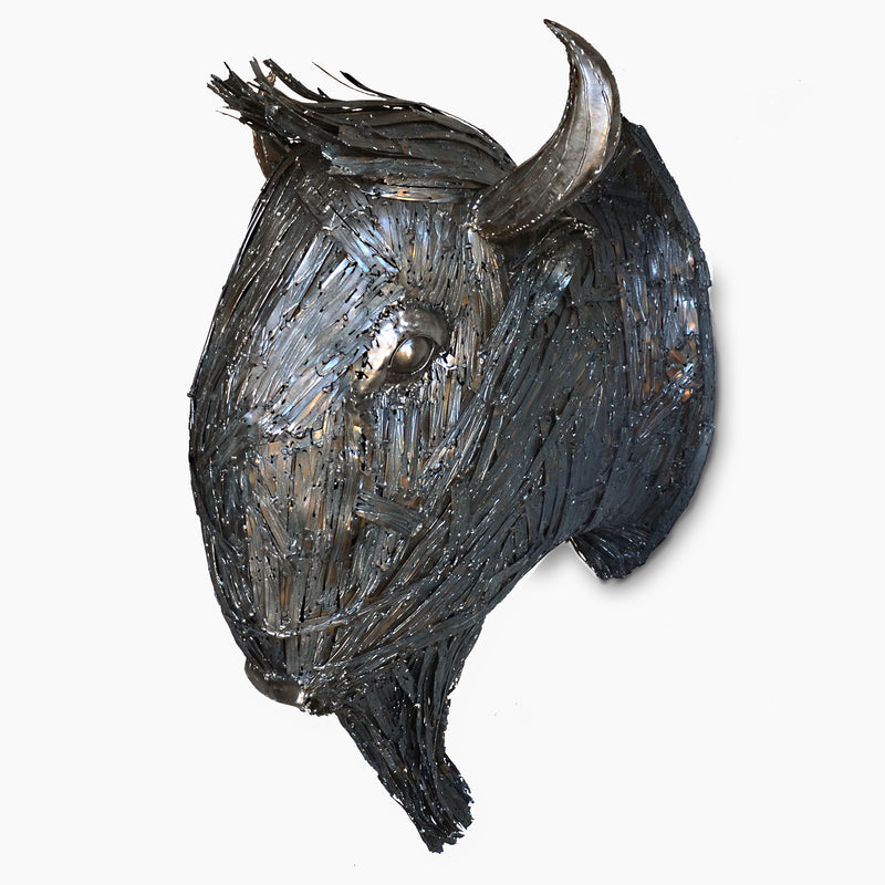 This bison was my first attempt at textured skinning. The sheet metal covering this sculpture consists of hundreds of thin strips that were hand cut, then welded together, with a final texturing by torch.