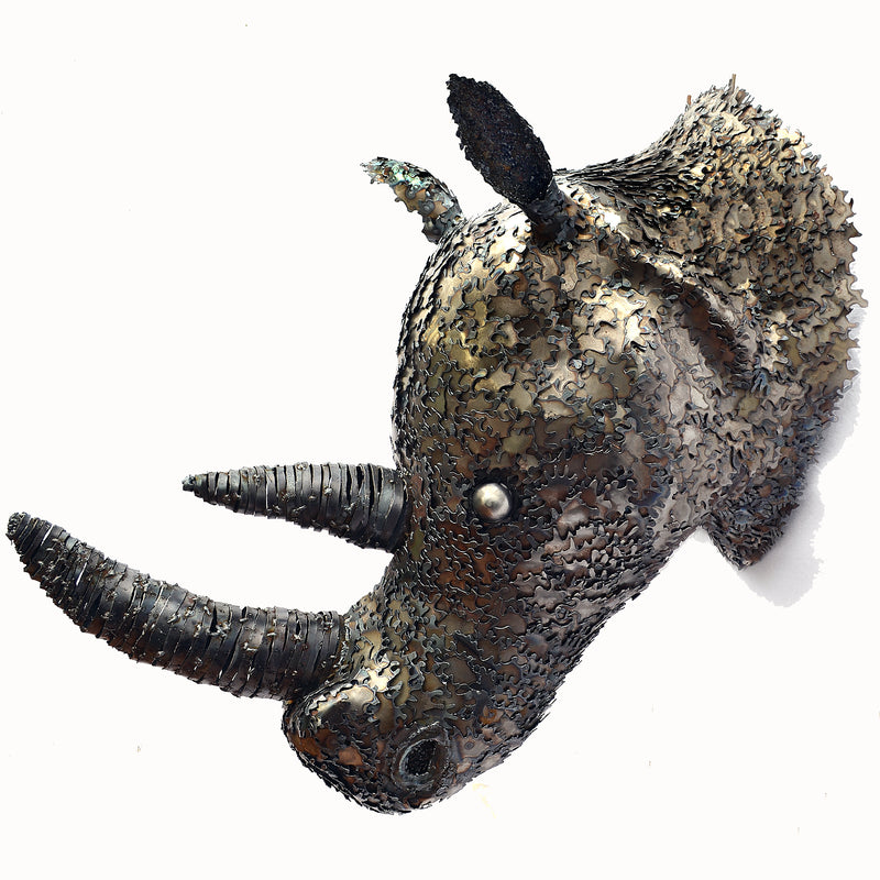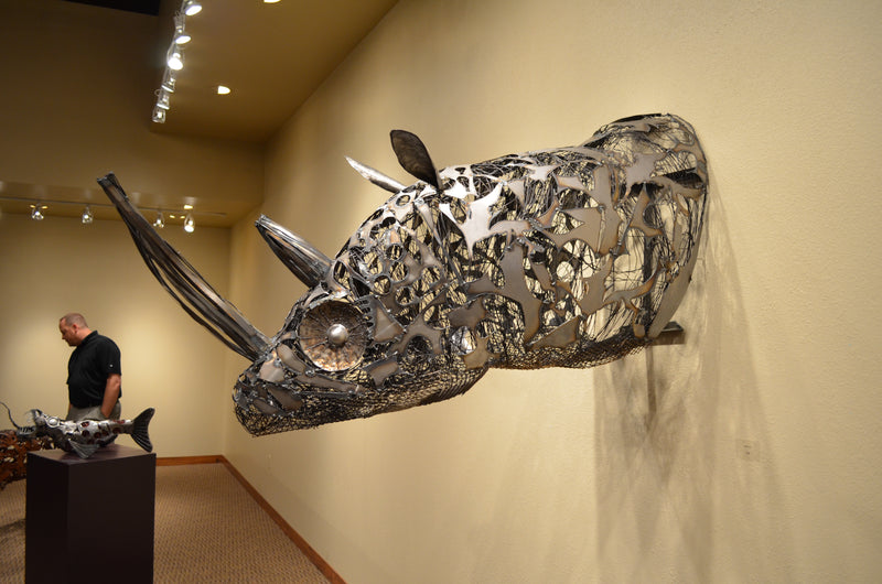 This was the fist time I carved out thousands of little puzzle pieces to create a sculpture. Randomly patterning them in an overlapping pattern across the rhino head gives it a unique and mesmerizing appearance.