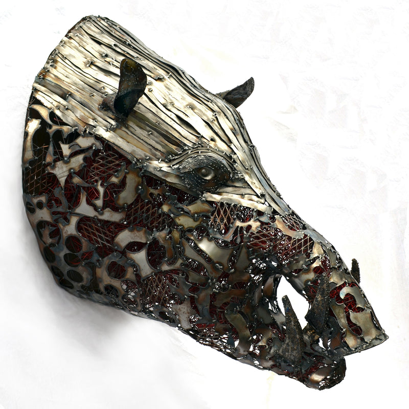 Over six feet in length, this wall mounted head was made from left over sheet metal scraps. I created it to give the overall appearance of a rhino head but I gave it some flourishes and elongated the neck.