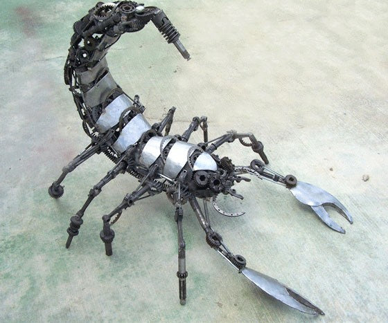 Commissioned for local collector who wanted to mix industrial engine components with aspects of the southwest, we decided on this scorpion. It took quite a while to get the thin legs to properly support the weight of the body, but it finally came together.